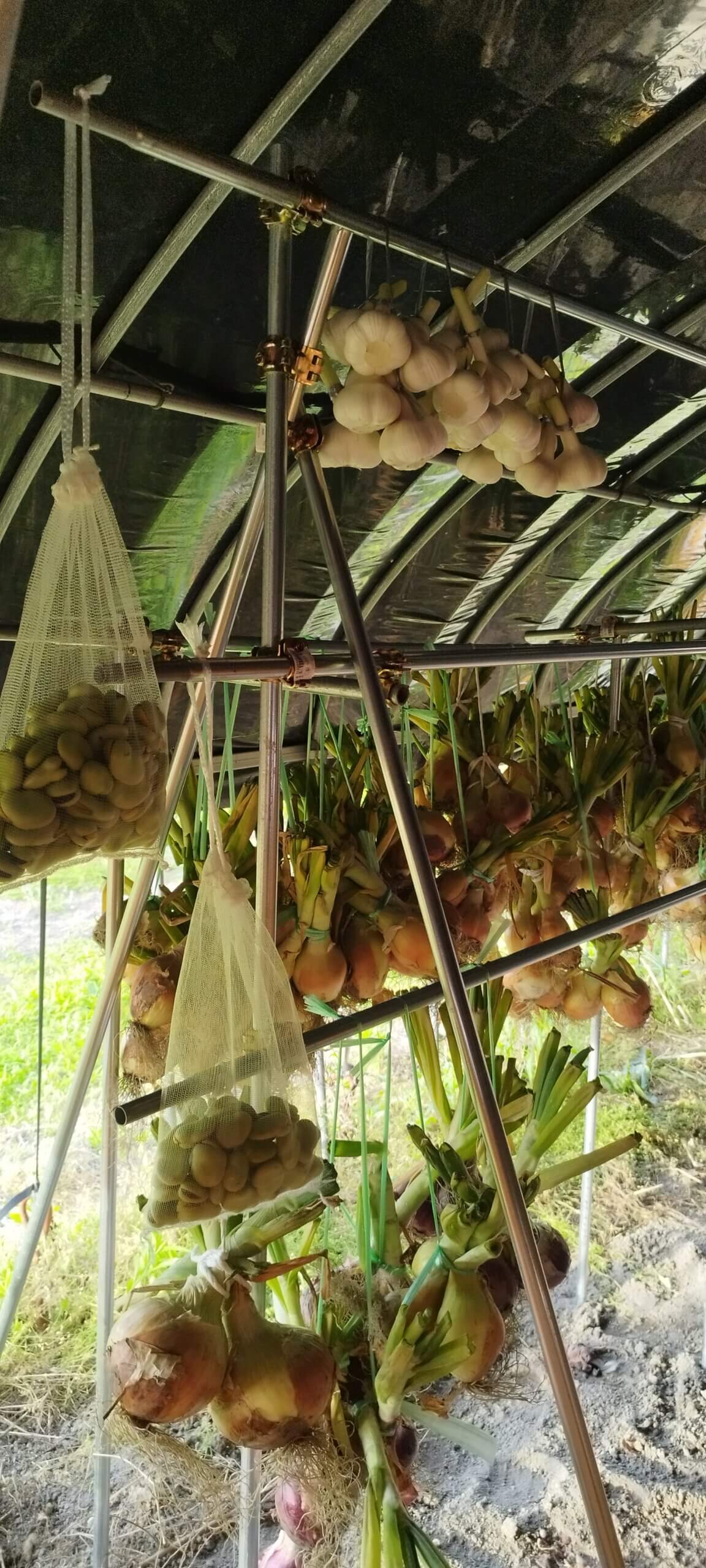 いままでは簡易の貯蔵ハウスの中に適当に吊るしてたのですが、今年は生産量を増やしたので適当に吊るすとスペースが足りません。そこでパイプを組んで立体的にニンニク等を吊るせるよう、乾燥棚をつくりました。
