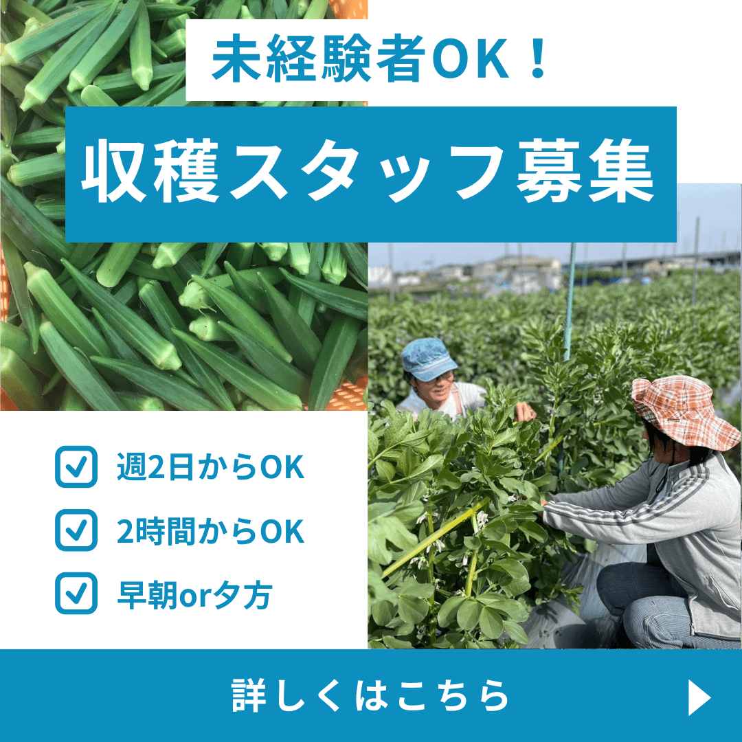 オクラの実を一つ一つハサミで収穫してカゴに入れていっていただきます。もし早く終わったらパック詰め作業もお手伝いしていただくことがあります。